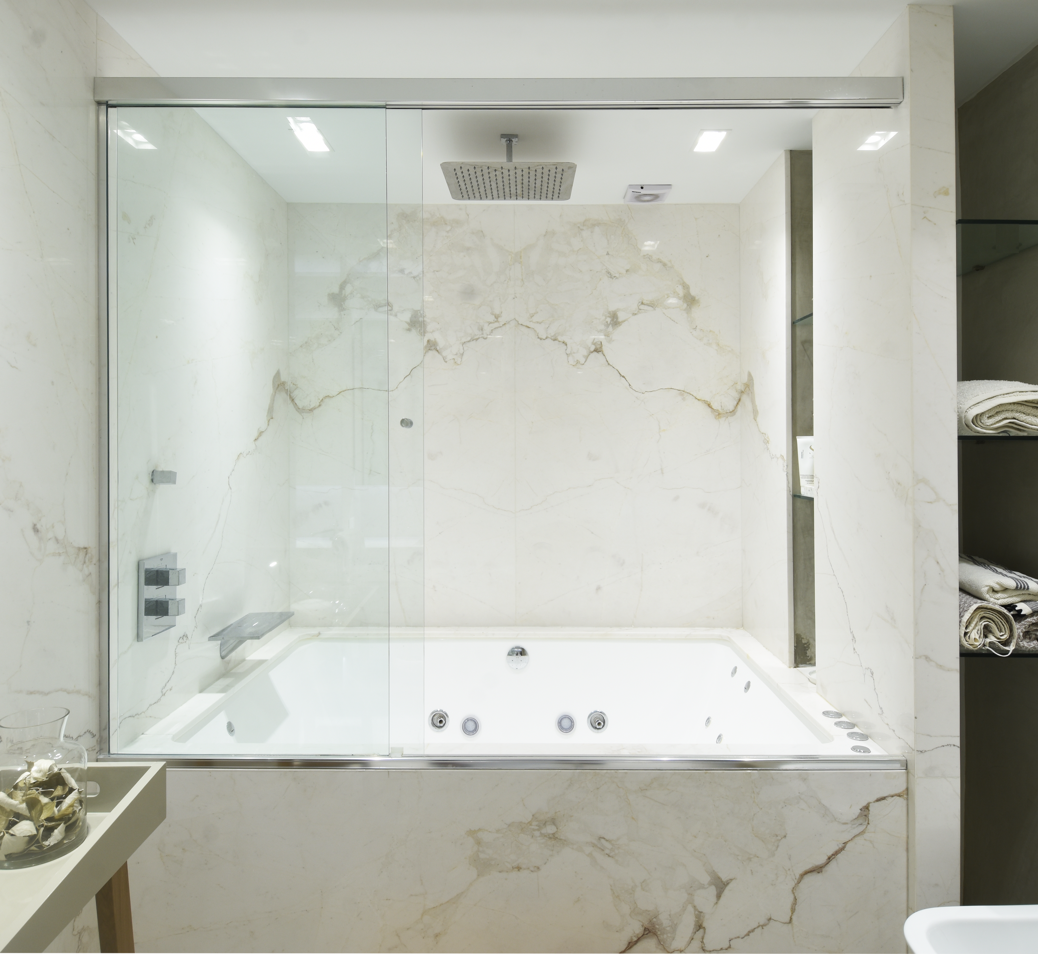 Se combinan revestimientos de madera con chapas tratadas y mármoles exóticos.